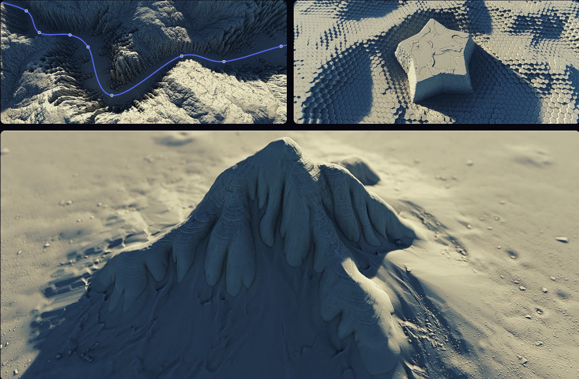 단순히 수치만 입력하는 방식에서 벗어나, 펜의 압력에 따라 지형의 침식 강도를 조절하거나 세밀한 스컬핑이 가능해졌습니다. 여기에 새롭게 추가된 Smooth 필터는 높이 맵 기반 작업 시 발생하기 쉬운 계단 현상이나 거친 노이즈를 마법처럼 정돈해 줍니다. 이제 더 이상 매끄러운 지표면을 위해 여러 번의 포스트 프로세싱을 거칠 필요가 없습니다.